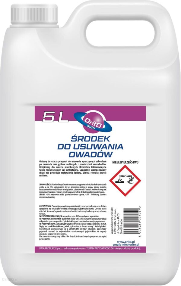Innowacyjny środek z gamy Orito Auto przeznaczony do usuwania zabrudzeń po owadach. Działa szybko i skutecznie! Preparat jest bezpieczny dla lakieru, plastikowych elementów lakierowanych, tablic rejestracyjnych czy reflektorów. Nie powoduje matowienia lakieru tak jak przy stosowaniu standardowych zasadowych preparatów. Wystarczą 2 minuty na działanie środka by pozbyć się uciążliwych zabrudzeń po owadach.SPOSÓB UŻYCIA: Preparat nanieść bezpośrednio na zabrudzoną powierzchnię. Po ok. 2 minutach osady są na tyle rozpuszczone, że bez problemu można je usunąć gąbką, szczotką lub strumieniem wody. Preparat można nanosić na szyby i klosze reflektorów Chronić oczy przed kontaktem z preparatem! Można stosować na mokre jak i suche zanieczyszczenia. Nie pozostawia smug. Odczyn PH ok. 11 Roztwór gotowy do użycia Temp. podłoża 1-40 °C Termin przydatności do użytku 24 miesiące